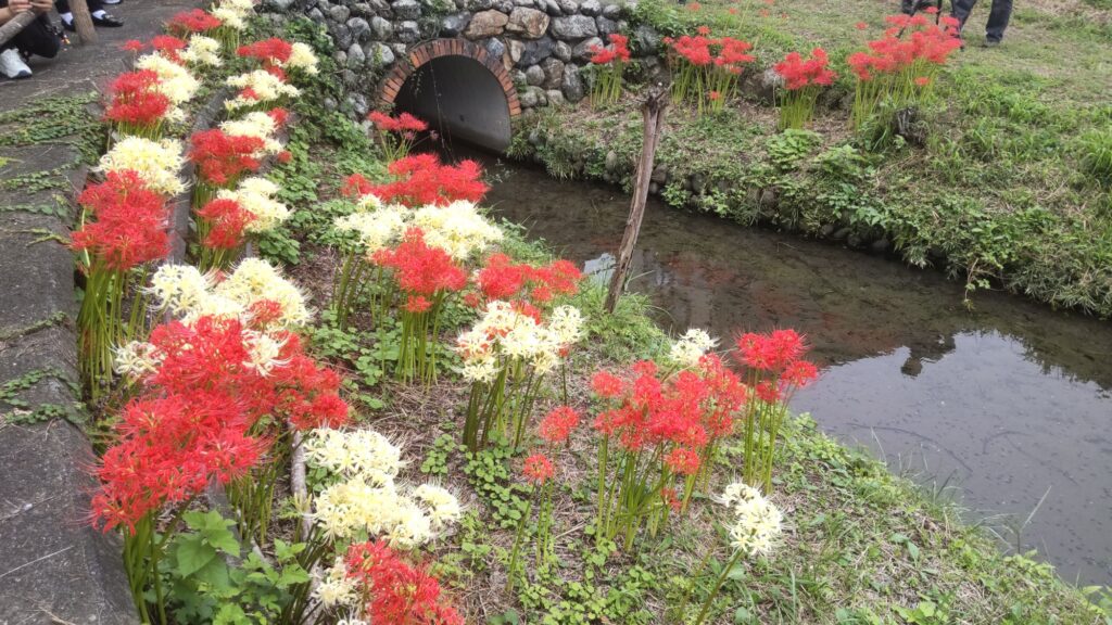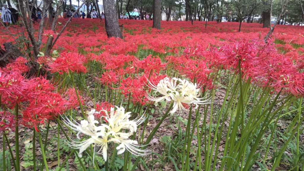 紅白の曼珠沙華は、美しさの中に可愛らしさも感じます。この風景、まだ会場に入っていません(笑)