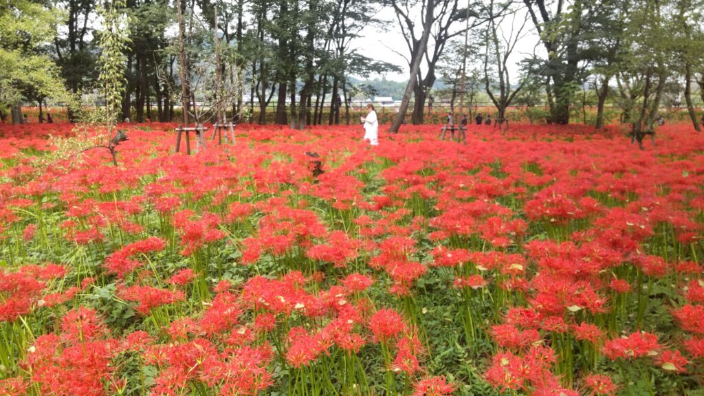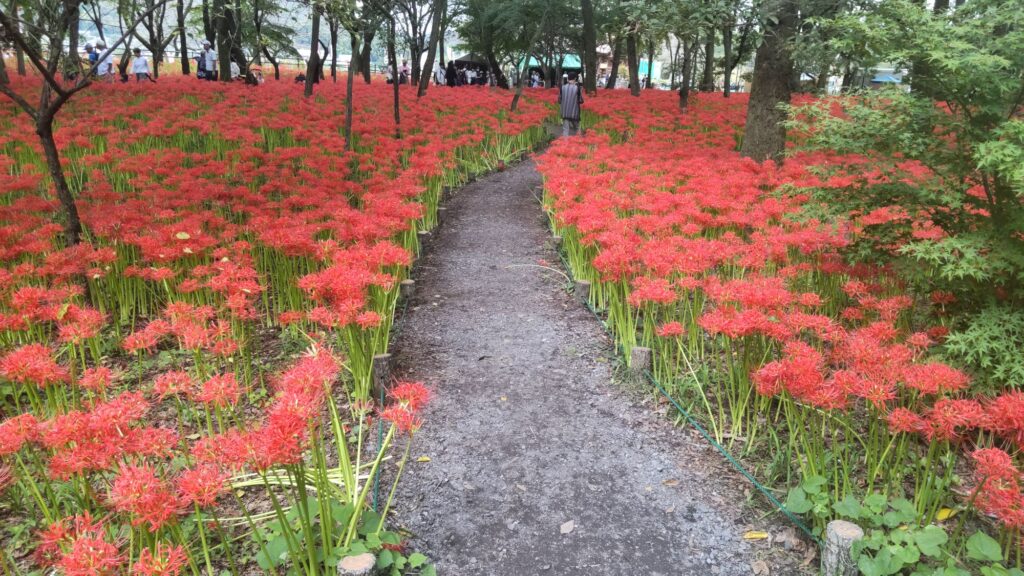 入場料を支払って、いざ会場内へ。会場は縦長なイメージ。とにかく奥行きがスゴい!地平線まで曼珠沙華なんじゃないかと思うくらい、赤い絨毯が続いています。